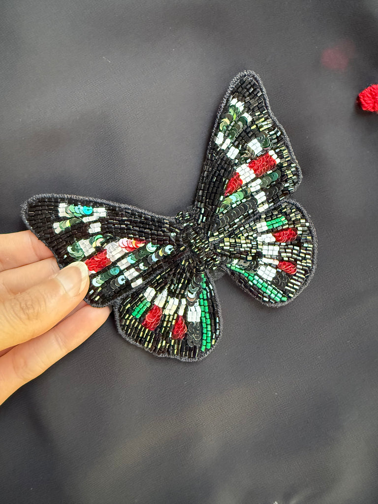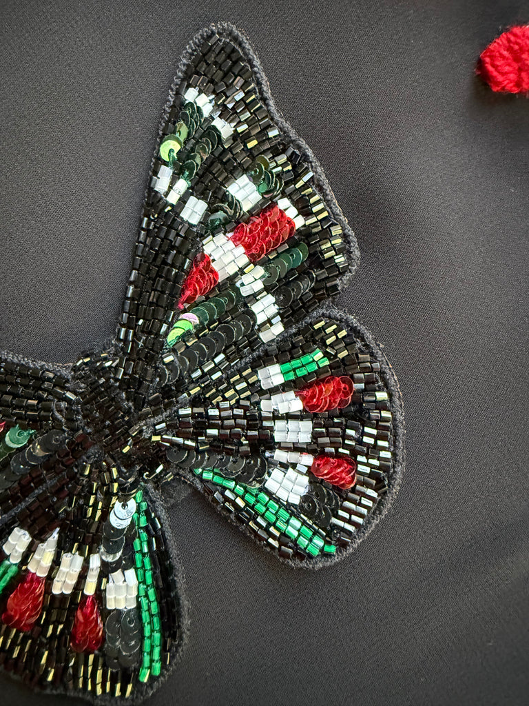 A 3D butterfly brooch, hand embroidered with sequence in the UAE’s national flag colors